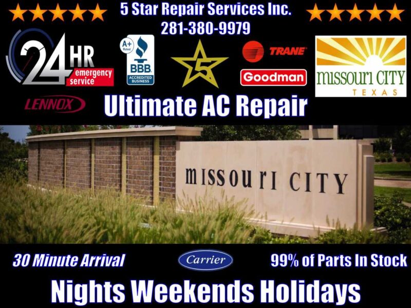 5 Star Repair Service Inc. specializes in Missouri City 77489 air conditioning, ac, & 24 hour HVAC emergency repair services. 5 Star Repair Service Inc. is a full service ac repair service company with over 20 years of elite technical and customer HVAC service experience. No matter how big or small the HVAC job happens to be, we are here to help make your heating and air conditioning units are working efficiently.